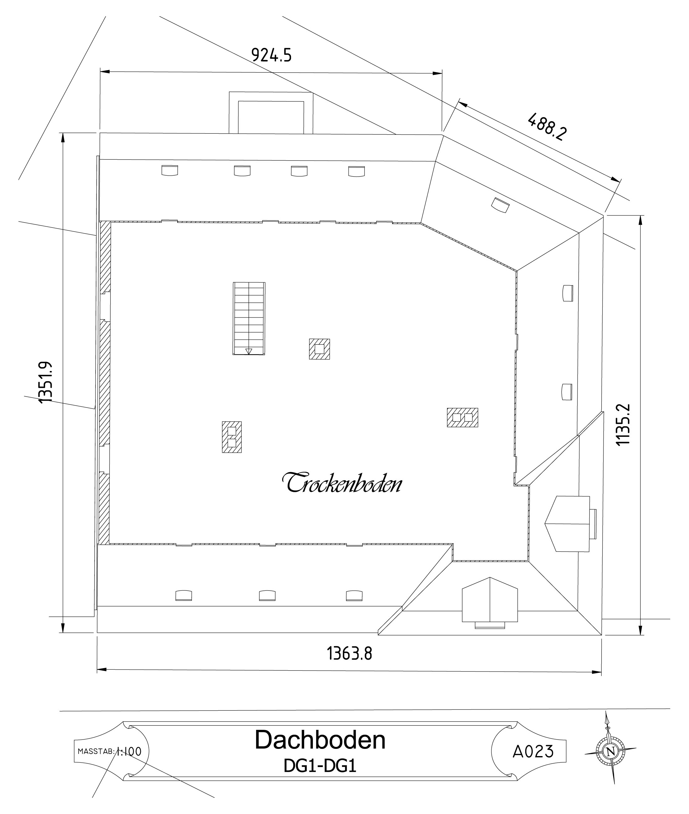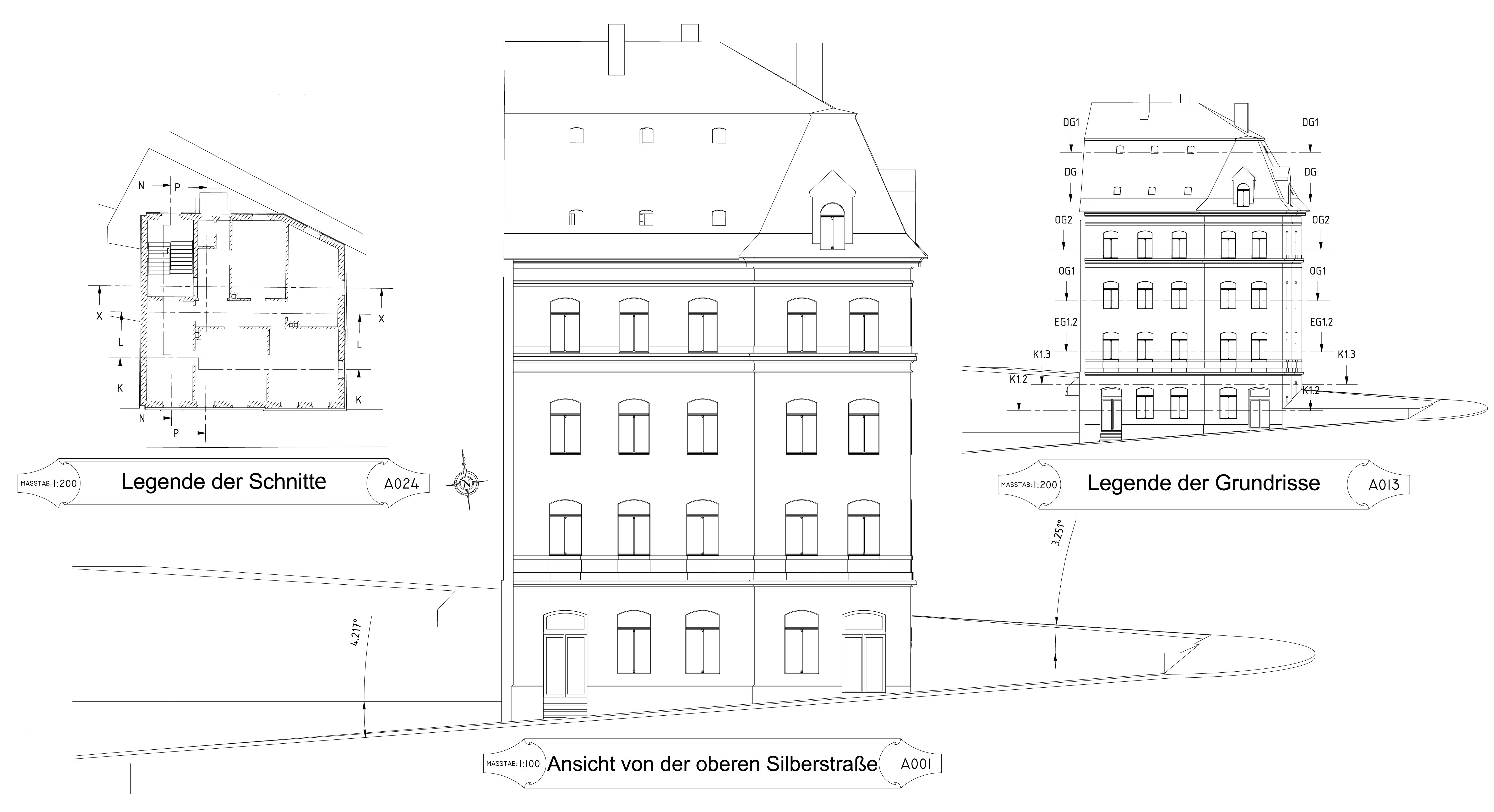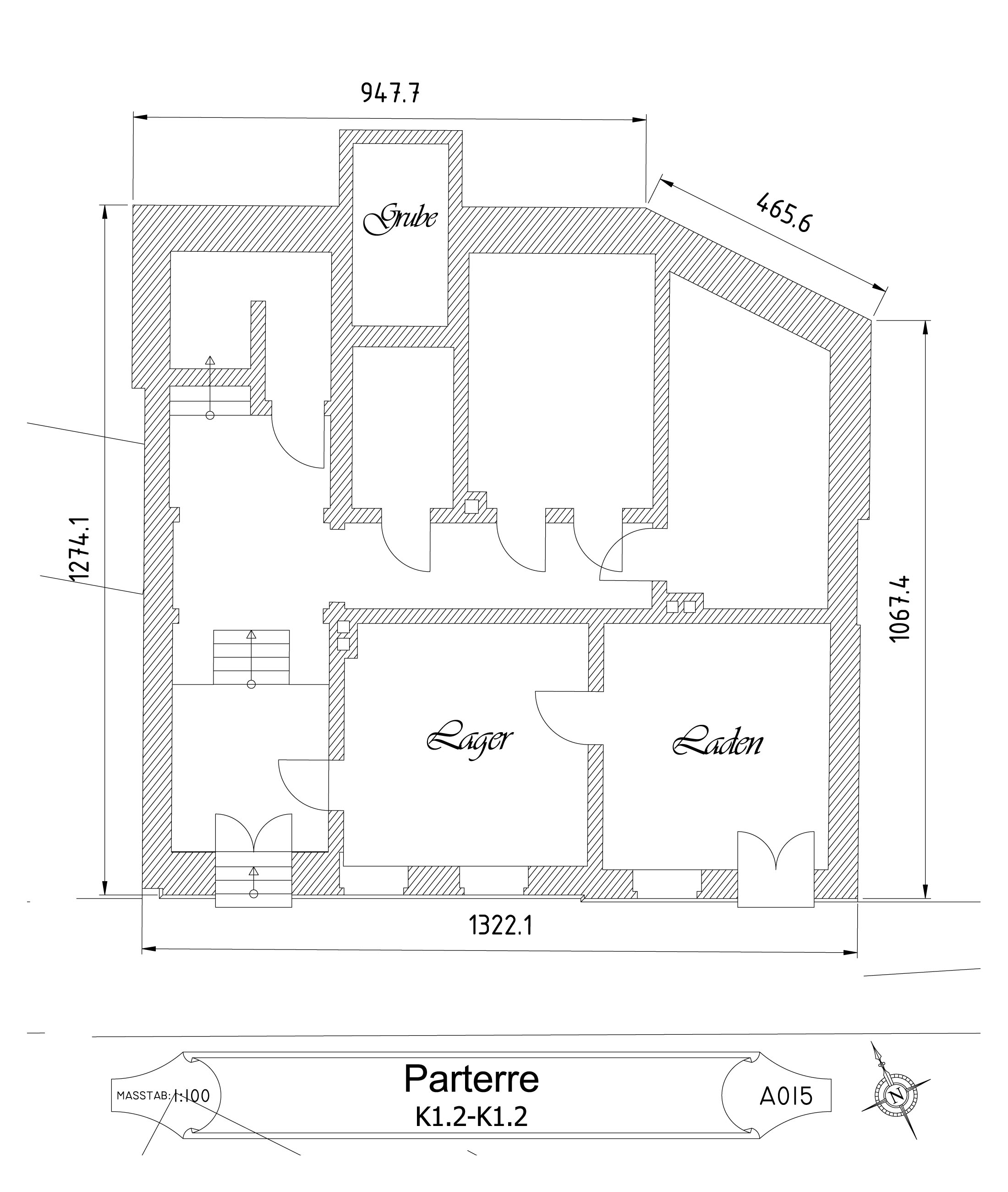 Die Vermessung der äußeren Abmessungen des Gebäudes und des Grundstücks erfolgte mit einem Baulaser. Dabei stellte sich heraus, dass die Gebäudeecken – mit Ausnahme des Treppenhauses – keine exakten 90°-Winkel bilden. Ich habe die Messungen mehrfach mit unterschiedlichen Methoden überprüft. Diese Winkel waren bereits ursprünglich im Fundament angelegt, und die präzise Arbeit der damaligen Bauhandwerker verdient großen Respekt.