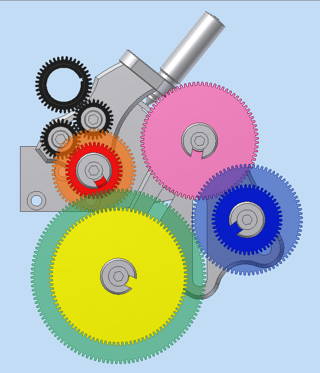 Der Gewindeschneidapparat ist im Wesentlichen ein Getriebe, das es der Längsschlitten des Kreuzschlittens ermöglicht, sich während der Spindeldrehung über eine bestimmte Strecke zu bewegen. Im Set sind 17 austauschbare Zahnräder enthalten, mit denen man die gängigsten Gewinde schneiden kann, sowohl metrische als auch Zoll-Gewinde. Die Montage auf einer dreifachen Lyra erweitert den Einsatzbereich. Auf Basis dieser Kombinationen habe ich den Kompaktbau der austauschbaren Zahnräder berechnet.