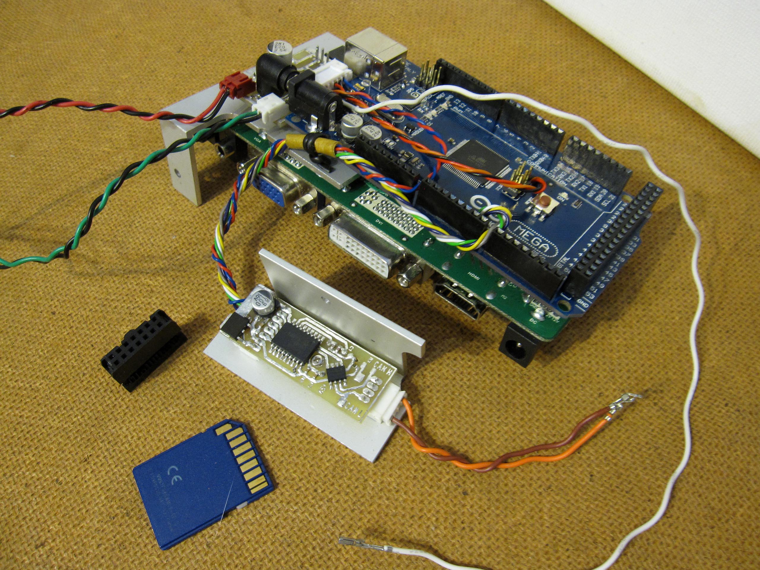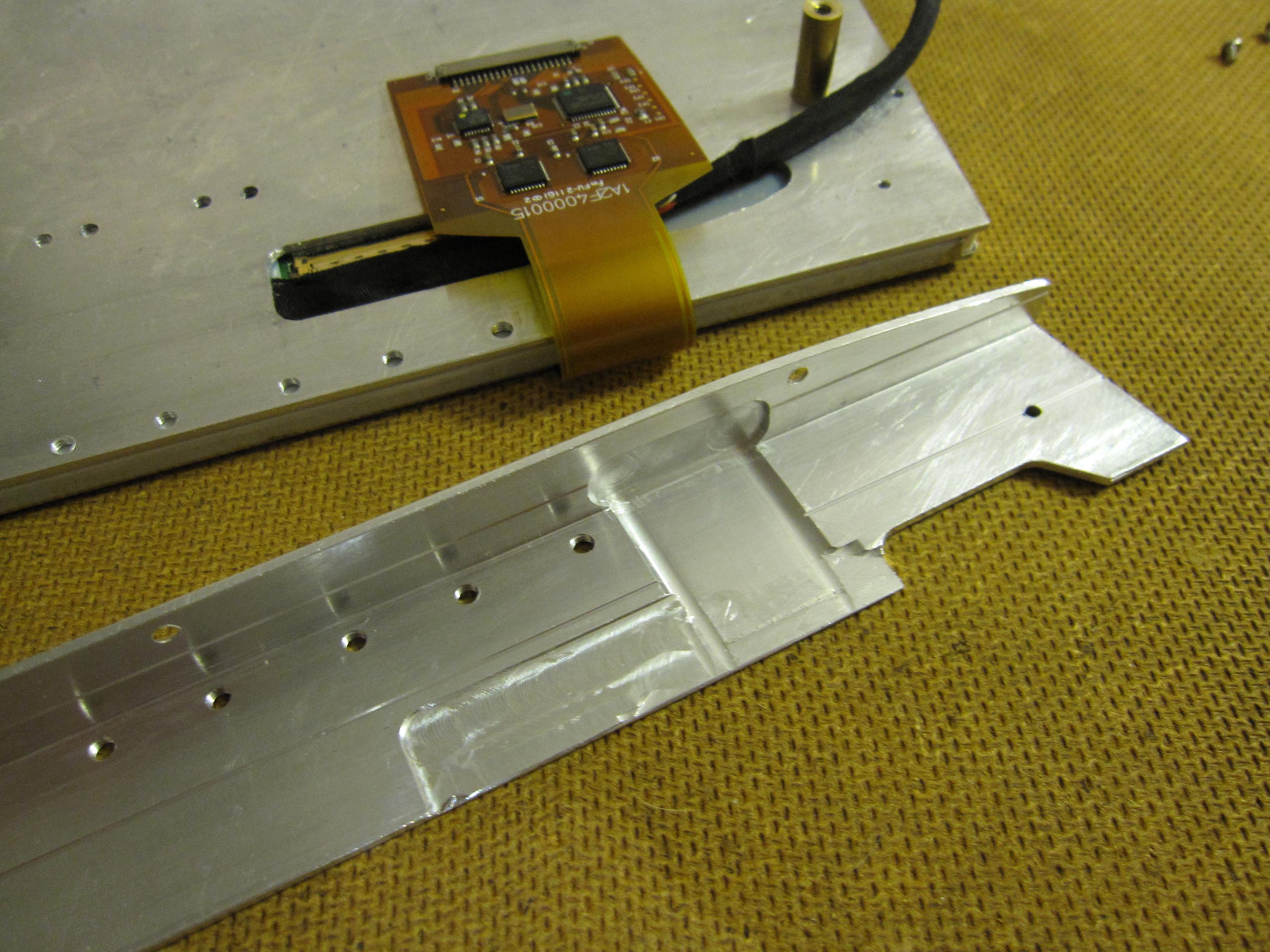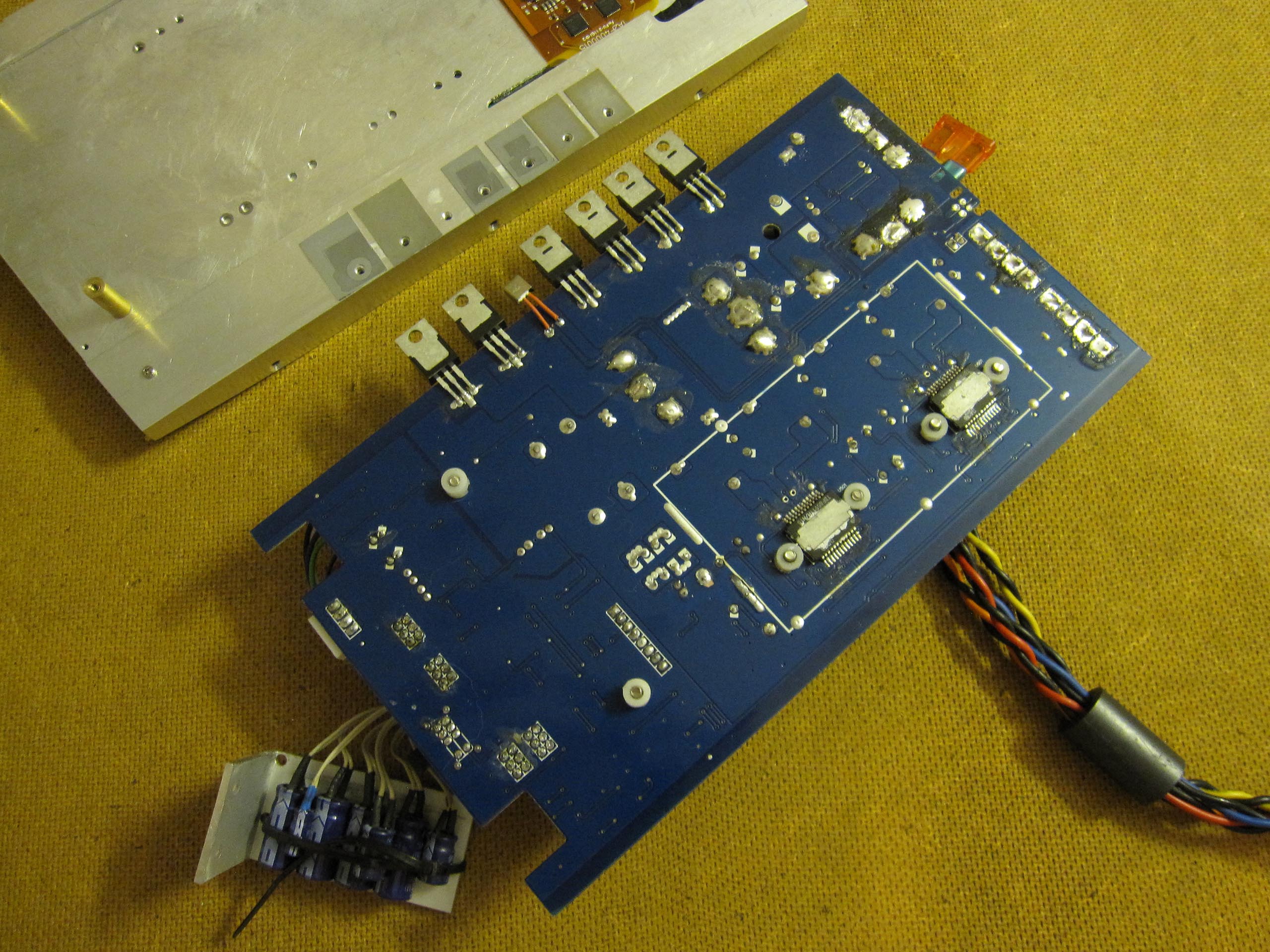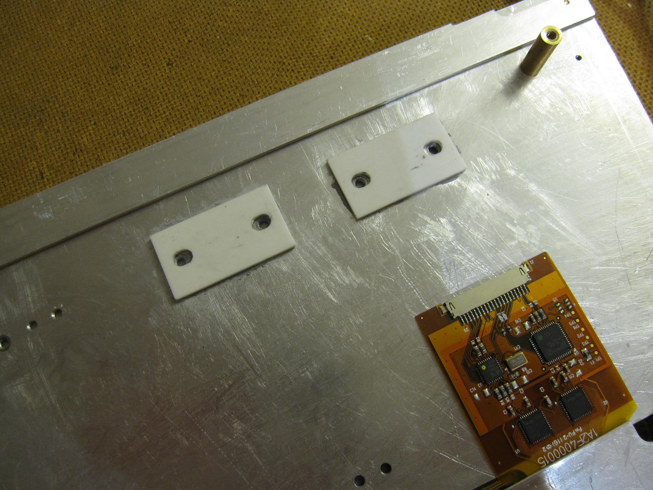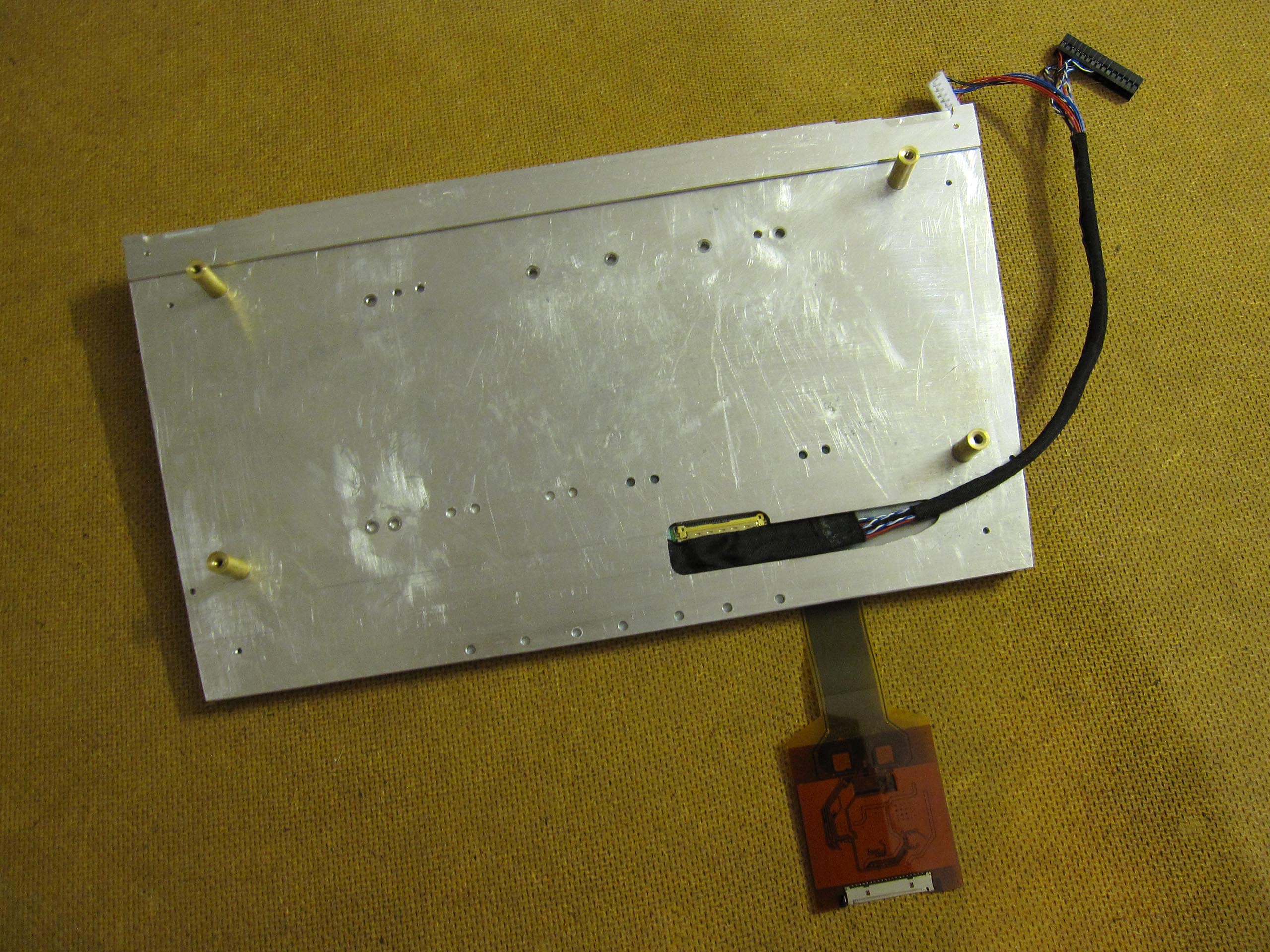 Die Hauptplatine habe ich auf einer Aluminiumplatte hinter dem Bildschirm montiert. Das Display ist auf der einen Seite der Aluminiumplatte befestigt, der Verstärker auf der anderen.