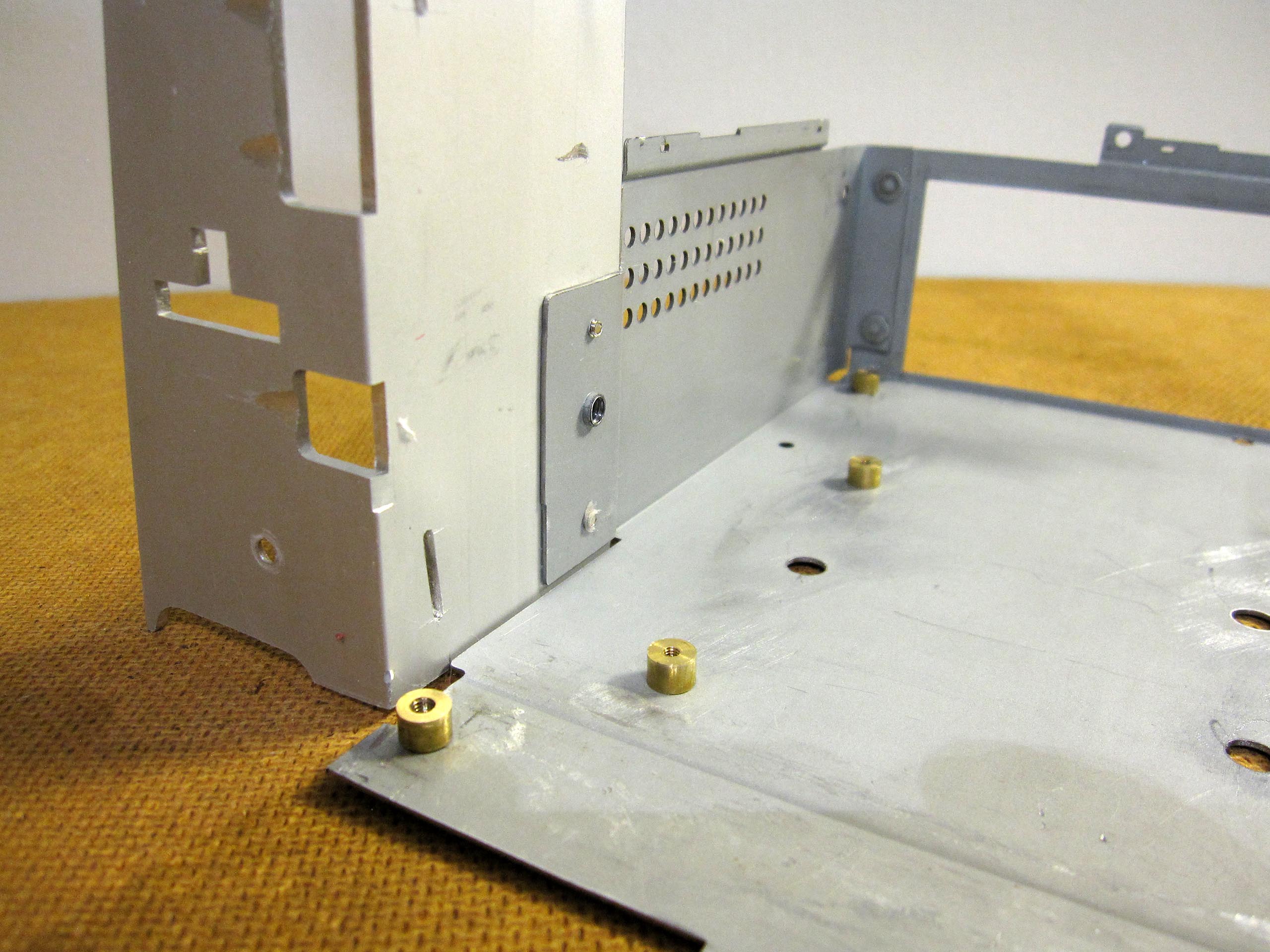 Die Stromversorgung, die Sicherung, die LED-Anzeigen sowie die Lautsprecheranschlüsse habe ich umgelötet und angepasst. Auch die Kondensatoren musste ich versetzen, damit ausreichend Platz für die RAM-Module vorhanden ist. Die Kabel zur kleinen Zusatzplatine habe ich durch längere ersetzt. Die Kondensatoren und diese Platine sind auf einem Aluminiumwinkel montiert. Zwei RCA-Buchsen habe ich ausgelötet, da sie nicht benötigt werden – dadurch entstand zusätzlicher Platz im Gehäuse.