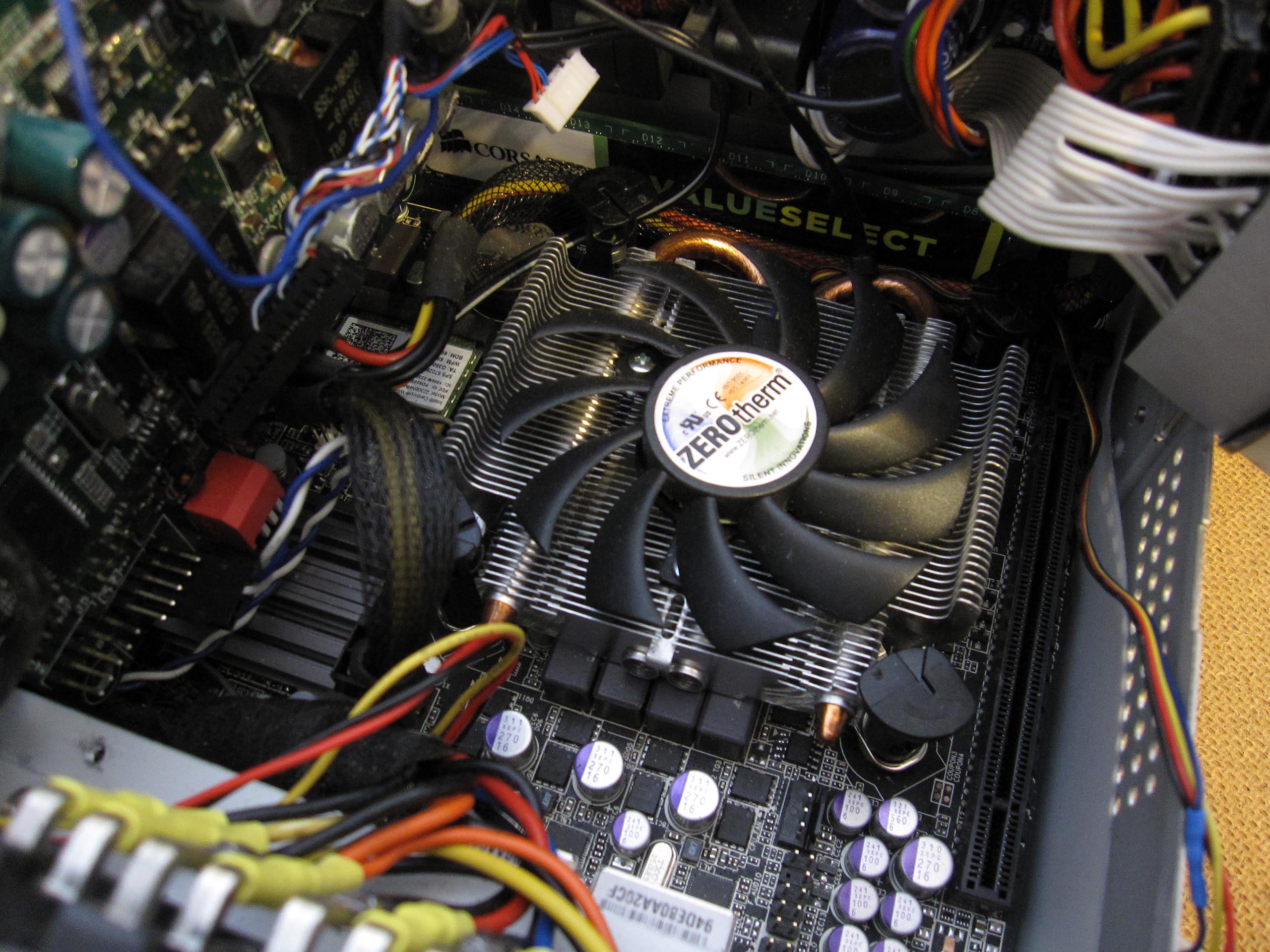 Nach mehreren Tests mit verschiedenen Kühlern entschied ich mich für den Zerotherm ATOM 30H Multi CPU Cooler. Offiziell ist er für maximal 65 Watt ausgelegt, kühlt jedoch den verbauten Intel Core i5-2500K (6M Cache, 3,30 GHz) mit 95 Watt TDP ausreichend. Da der Platz sehr begrenzt ist, stellt dieser Kühler den besten Kompromiss dar.