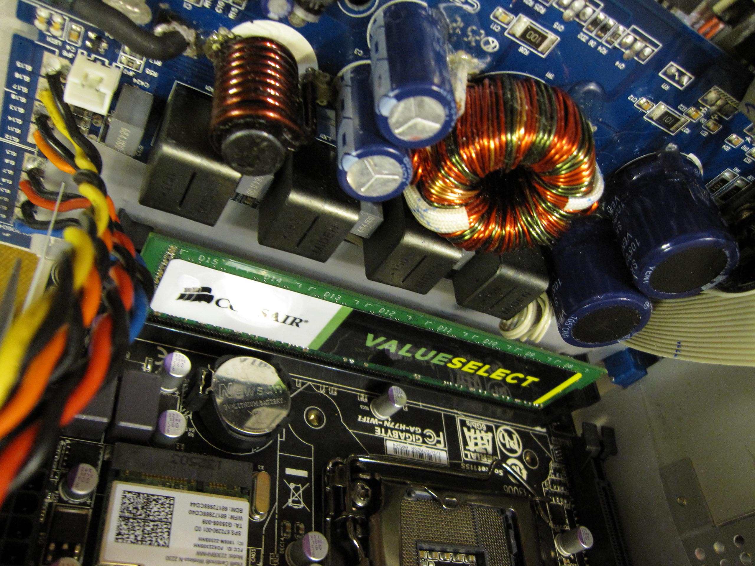 Der Arbeitsspeicher befindet sich neben dem Audioverstärker. Auf dem Mainboard sind zwei Steckplätze für Speichermodule vorhanden. Derzeit ist nur ein Corsair CMV8GX3M1A1333C9 mit 8 GB installiert.