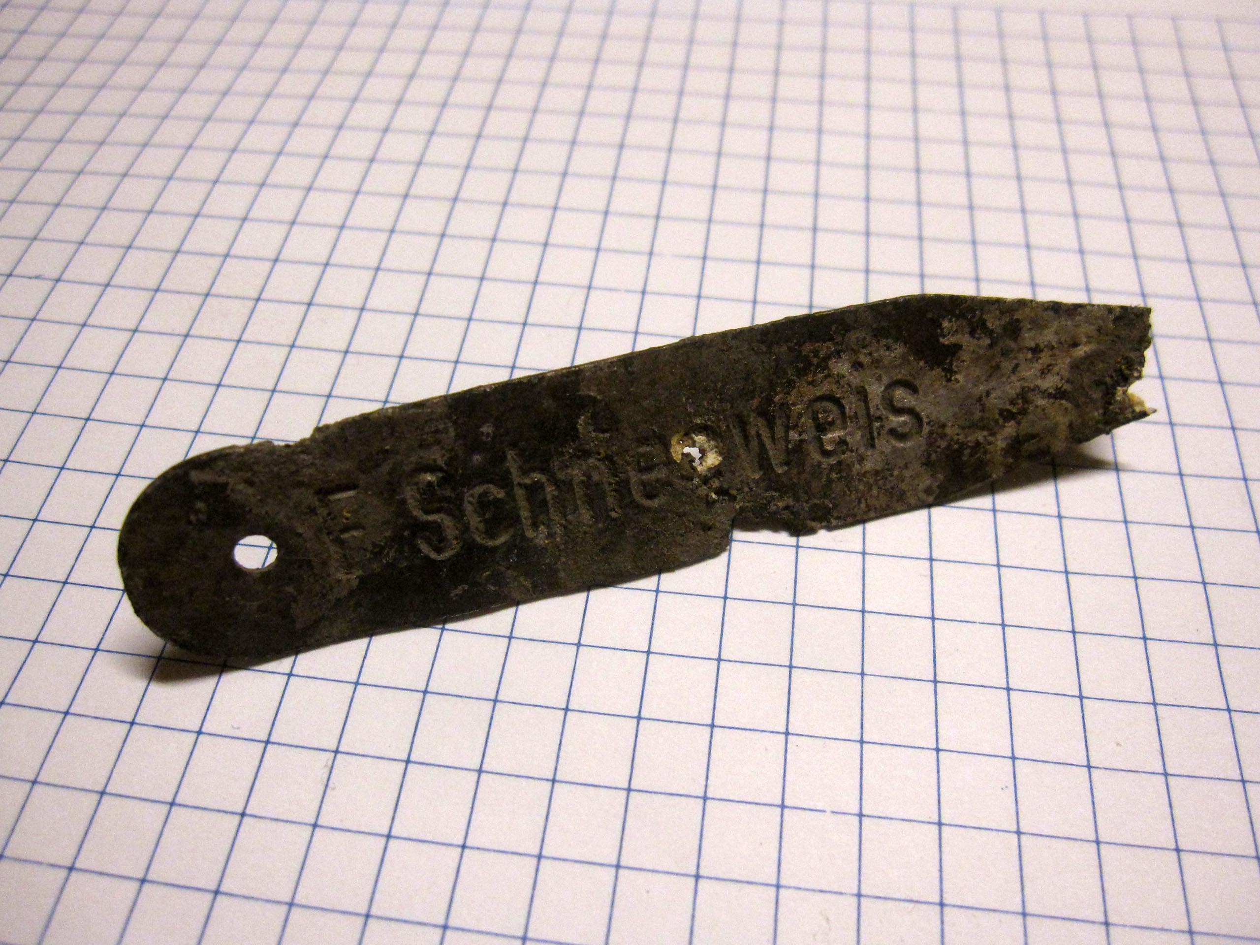 Emma Schneeweiß war die Ehefrau von Otto Schneeweiß, dem Eigentümer des Hauses in den 1920er bis 1940er Jahren. Auf der Marke steht „E. Schneeweis“. Dabei handelt es sich nicht einfach nur um eine Aluminiumplatte. Mit diesem Gegenstand ist eine sehr interessante Geschichte des Alltagslebens im vergangenen Jahrhundert verbunden. Vor hundert Jahren war dieses Objekt unter Hausfrauen sehr verbreitet. Frauen bereiteten zu Hause den Teig vor, da sie selbst keinen Backofen besaßen. Anschließend brachten sie den Teig zu speziellen Bäckereien, wo er gebacken wurde. Dort wurden solche persönlichen Namensmarken benötigt, da viele Menschen diesen Service nutzten. Die Marke wurde mit der spitzen Seite in den Teig gesteckt und so in den Ofen gegeben. Auf diese Weise konnte keine Verwechslung entstehen, wem welches Brot oder Gebäck gehörte.