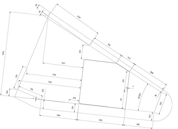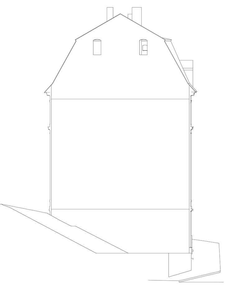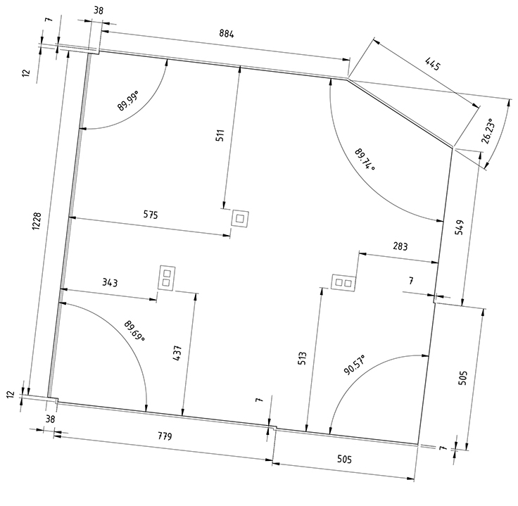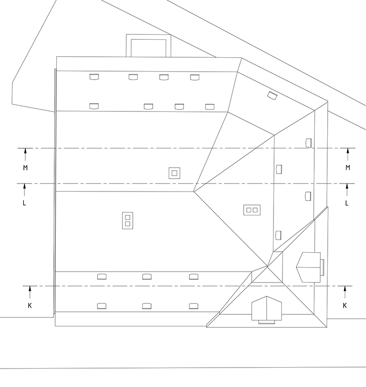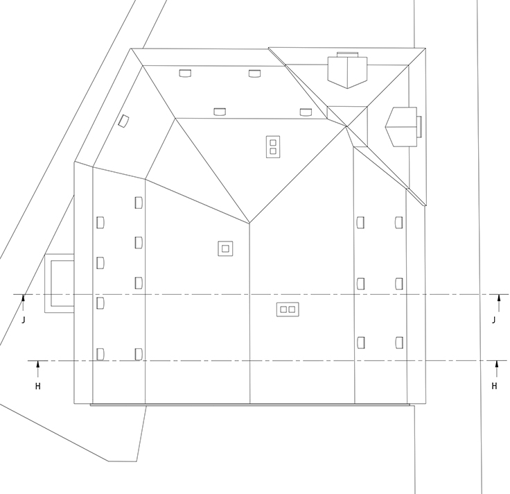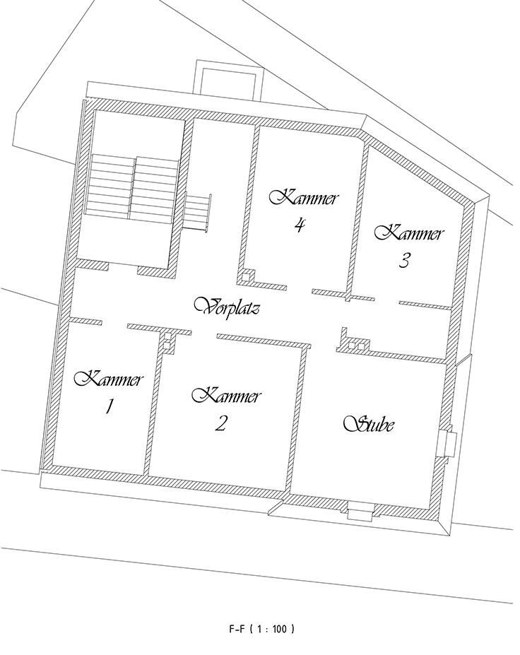 Die Vermessung hat ergeben, dass das Gebäude nicht rechtwinklig ist. Ich habe mehrmals die Messergebnisse überprüft. Da nur das Treppenhaus einen rechtwinkligen Grundriss hat, wurde das Fundament bewusst so angelegt. Die Baumeister haben sehr Präzise gearbeitet. Die Abweichungen betragen manchmal wenige Millimeter.