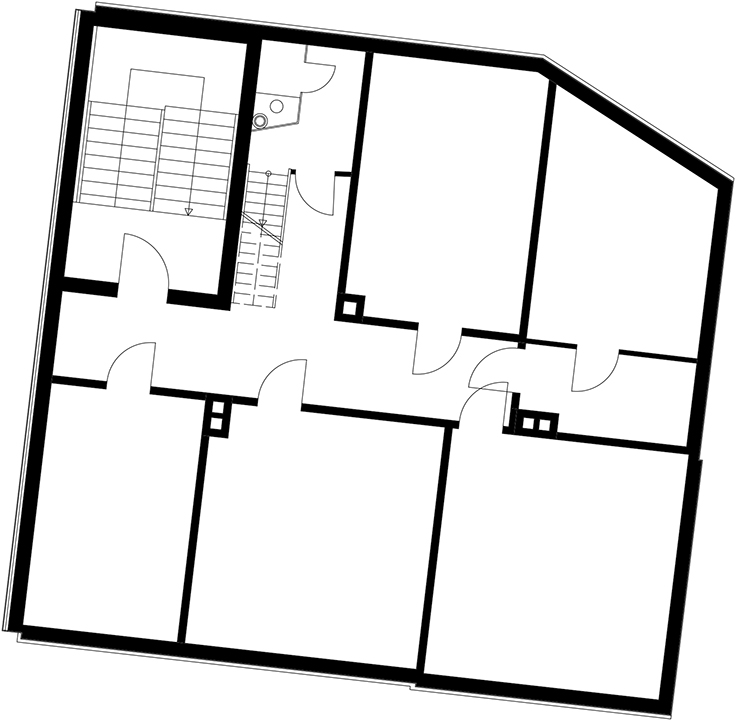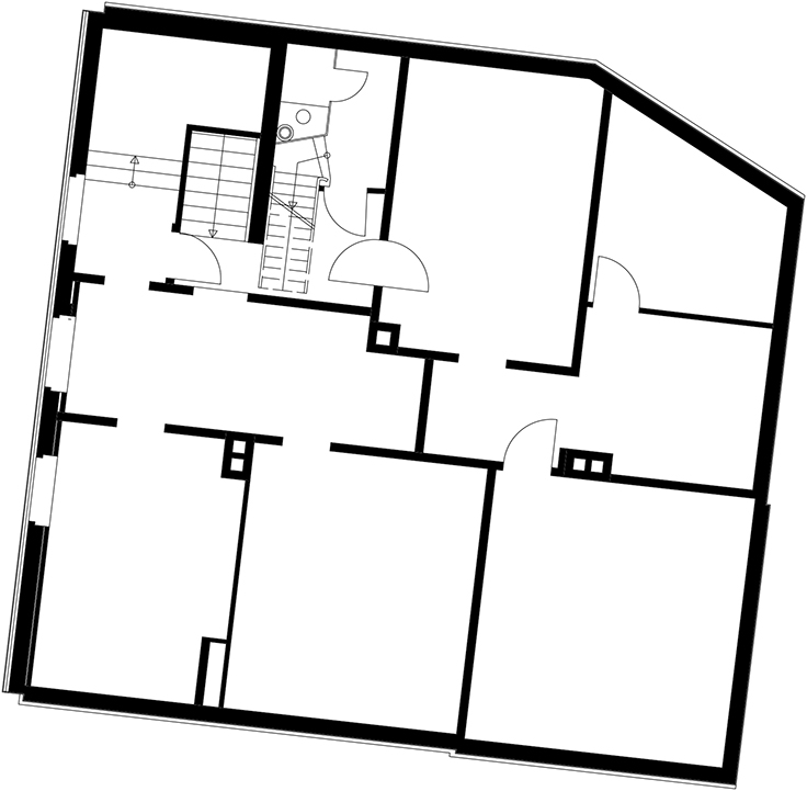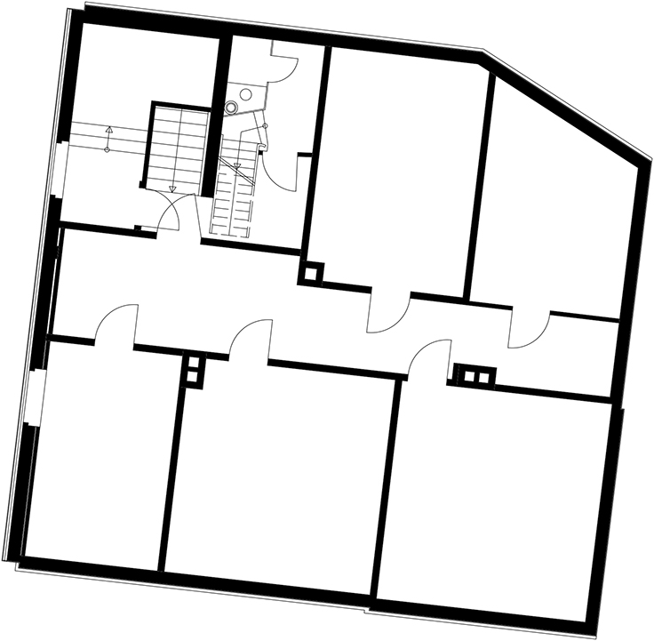 Ursprünglich war das Treppenhaus angefangen im ersten Stockwerk durchgehend von einer massiven 28 cm starken Brandschutzmauer aus Vollziegel umgeben. Die restlichen Innenwände sind als Fachwerk ausgeführt. Die Toilette war im Dachgeschoss mit Holzwänden abgegrenzt.