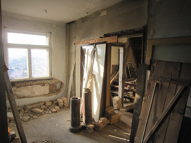 Zu DDR Zeit teilte man das Dachgeschoss in zwei Wohnungen auf. Ein drittes Fenster wurde in die Mitte der Giebelwand durchbrochen. Die Tür aus dem Treppenhaus wurde mit Pappe zugenagelt. Weitere Türenöffnungen wurden geschaffen und mehrere Schiebetüren eingebaut. Alle nachträglich versetzte oder eingebaute Wände sind aus massiven Ziegel gemauert und haben kein Holzfachwerk.