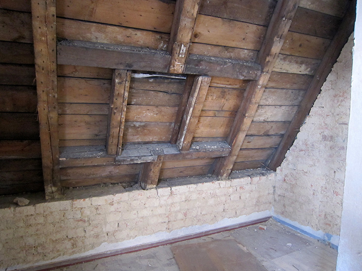Als wir im Dachgeschoss die Vorsatzwände entfernt haben und unterschiedliche Baustoffe festgestellt haben wurde uns immer mehr deutlich wie das Dachgeschoss und insbesondere das Treppenhaus umgebaut wurde.