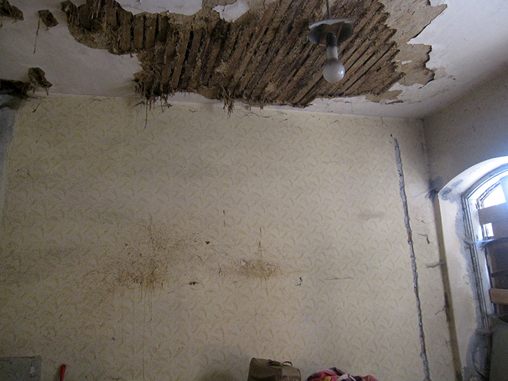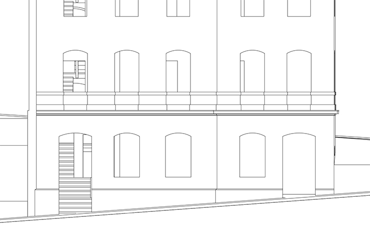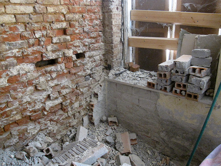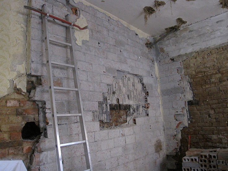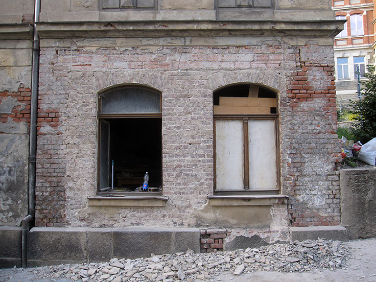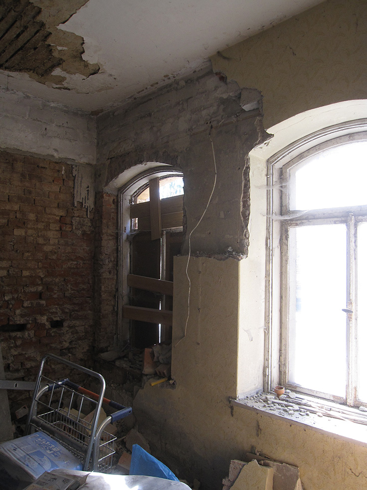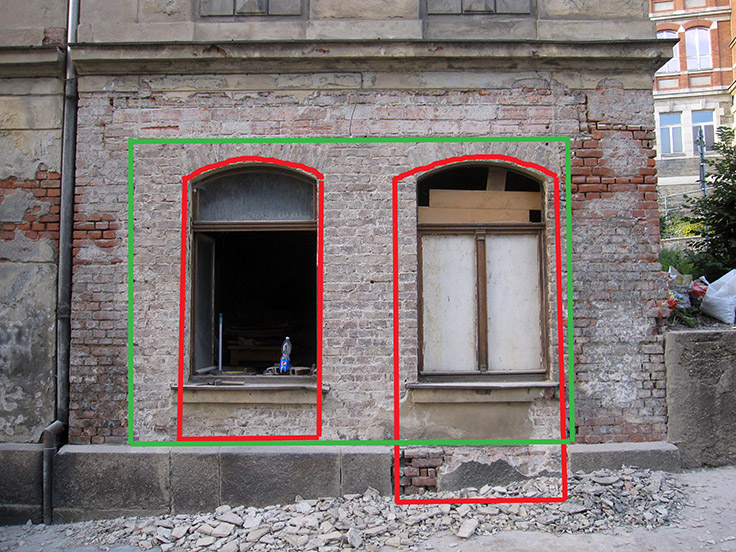 Auf dem Bild ist mit roten Linien der ursprüngliche Ladeneingang eingezeichnet. Die Tür war genauso breit wie die Haupteingangstür. Also 1,4 m breit. Somit hatte die Fassade eine Symmetrie. Rechts und links waren die Türen und dazwischen drei gleichgroße Fenster. Dann wurde ca. 1930 die Tür durch ein großes Schaufenster ersetzt. Es ist nicht ganz klar ob das neue Schaufenster eine Tür hatte. Die Umrisse sind mit grünen Linien eingezeichnet. Der Umbau ist sehr aufwendig. Mehrere Stahlträger wurden eingesetz. Das Schaufenster war 2,6 m hoch und 3,6 m breit. Nach Aussagen der Nachbarn gab es seit mindestens 1960-ger kein Laden drin