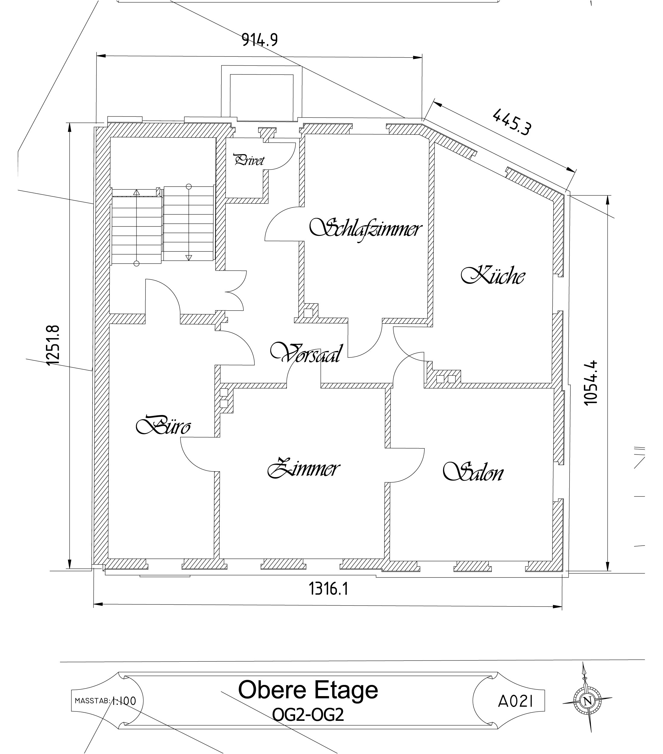 Die Vermessung der äußeren Abmessungen des Gebäudes und des Grundstücks erfolgte mit einem Baulaser. Dabei stellte sich heraus, dass die Gebäudeecken – mit Ausnahme des Treppenhauses – keine exakten 90°-Winkel bilden. Ich habe die Messungen mehrfach mit unterschiedlichen Methoden überprüft. Diese Winkel waren bereits ursprünglich im Fundament angelegt, und die präzise Arbeit der damaligen Bauhandwerker verdient großen Respekt.