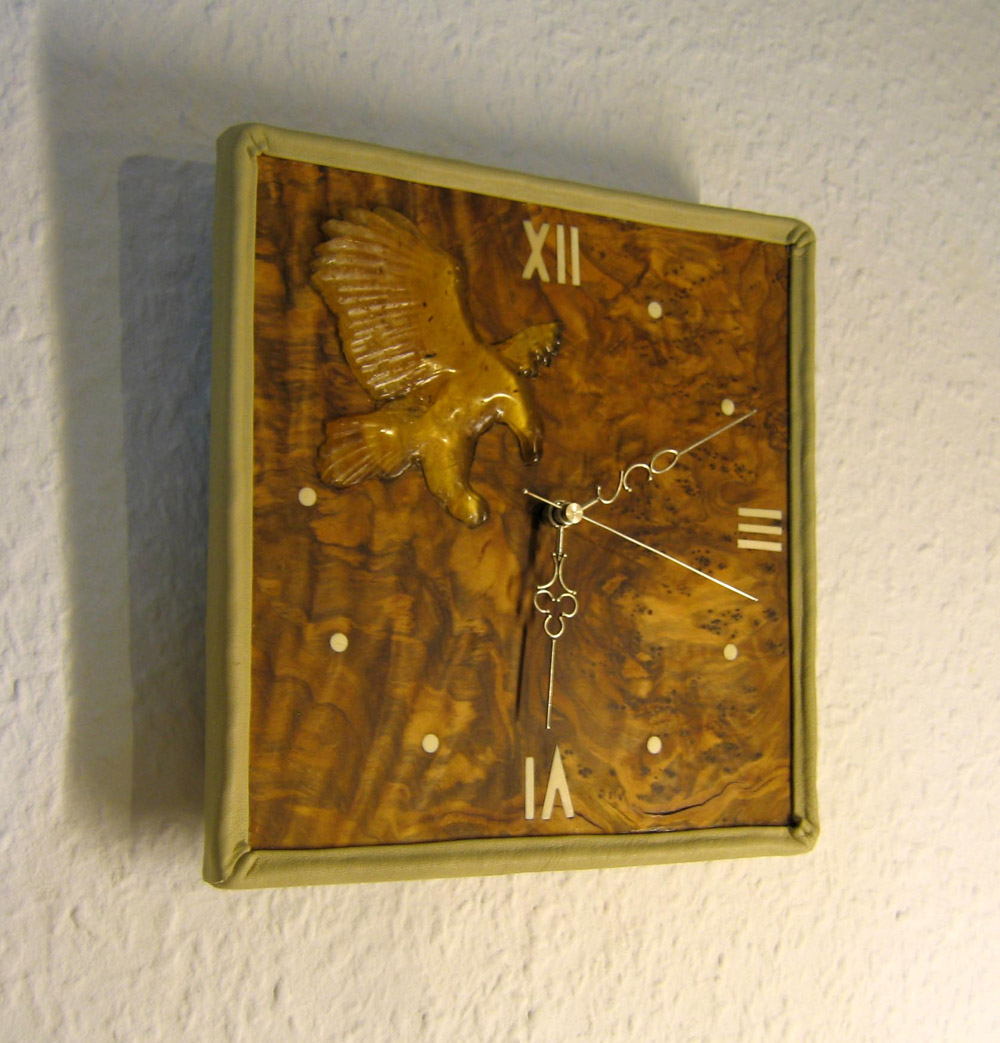 "Adler fängt Zeit" Deuchland 2008 Автор: Alexander Babel Zifferblatt: Olivenbaum Ziffern: Mammutelfenbein Flachrelief des Adlers: Bernstein Zeiger: Silber 935 Rahmen: Leder