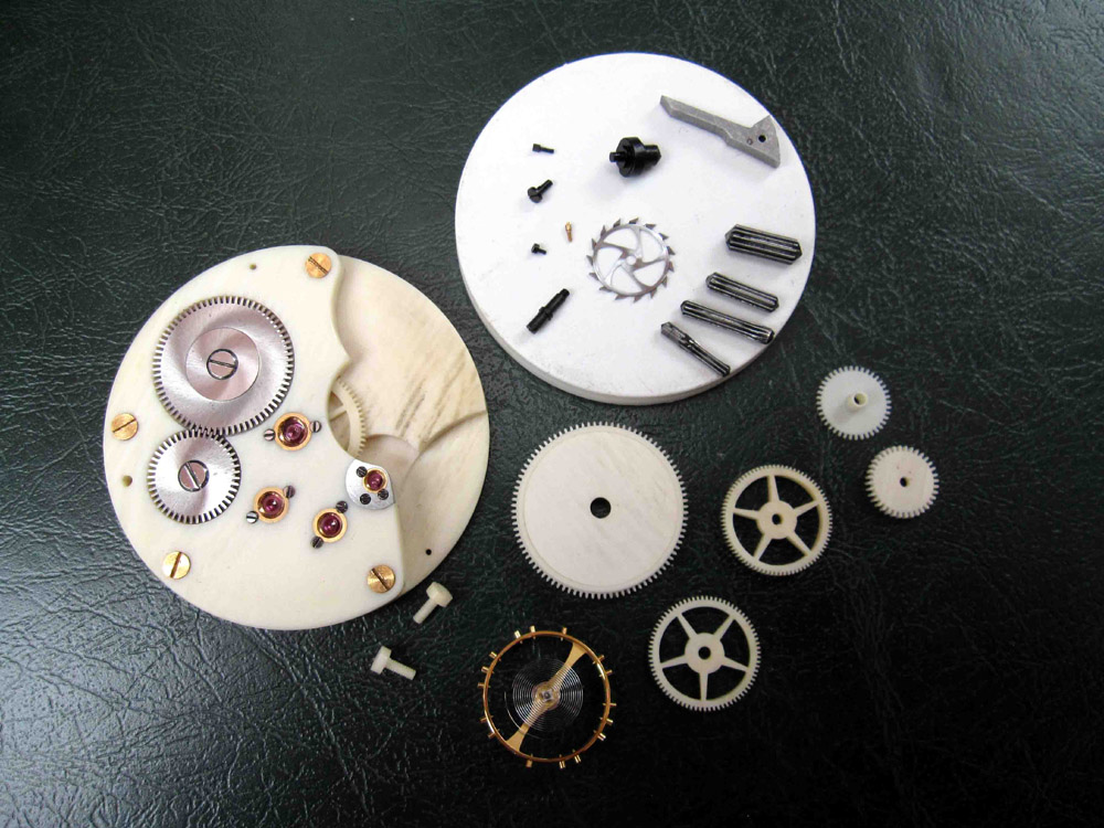 Ein Jahr später gelang es mir bereits, erste Teile für mein Uhrwerk in Handarbeit zu fertigen. Bei der Herstellung der Uhrwerkteile kamen verschiedene Werkstoffe zum Einsatz: Die Platinen, das Federhaus, einige Schrauben und die Zahnräder fertigte ich aus Elfenbein. Chatons und weitere Schrauben sind aus 22 karätigem Gold. Der Glashütter Sonnenschliff verziert sowohl das Kron-, als auch das Sperrrad. Das Chronometerrad mit einem Durchmesser von 9,4 mm ist nach einem eigenen Entwurf in traditioneller Handarbeit mit Nadelfeilen und Sägebogen von mir selbst gefertigt worden. Dazu habe ich das Rad in fünf Kreissegmente aufgeteilt und danach die Schenkel unter dem Mikroskop gefeilt. Die Zähne habe ich auf einer Schaublin mit Teilvorrichtung und einem von mir selbstgefertigtem Einzahnfräser realisiert.