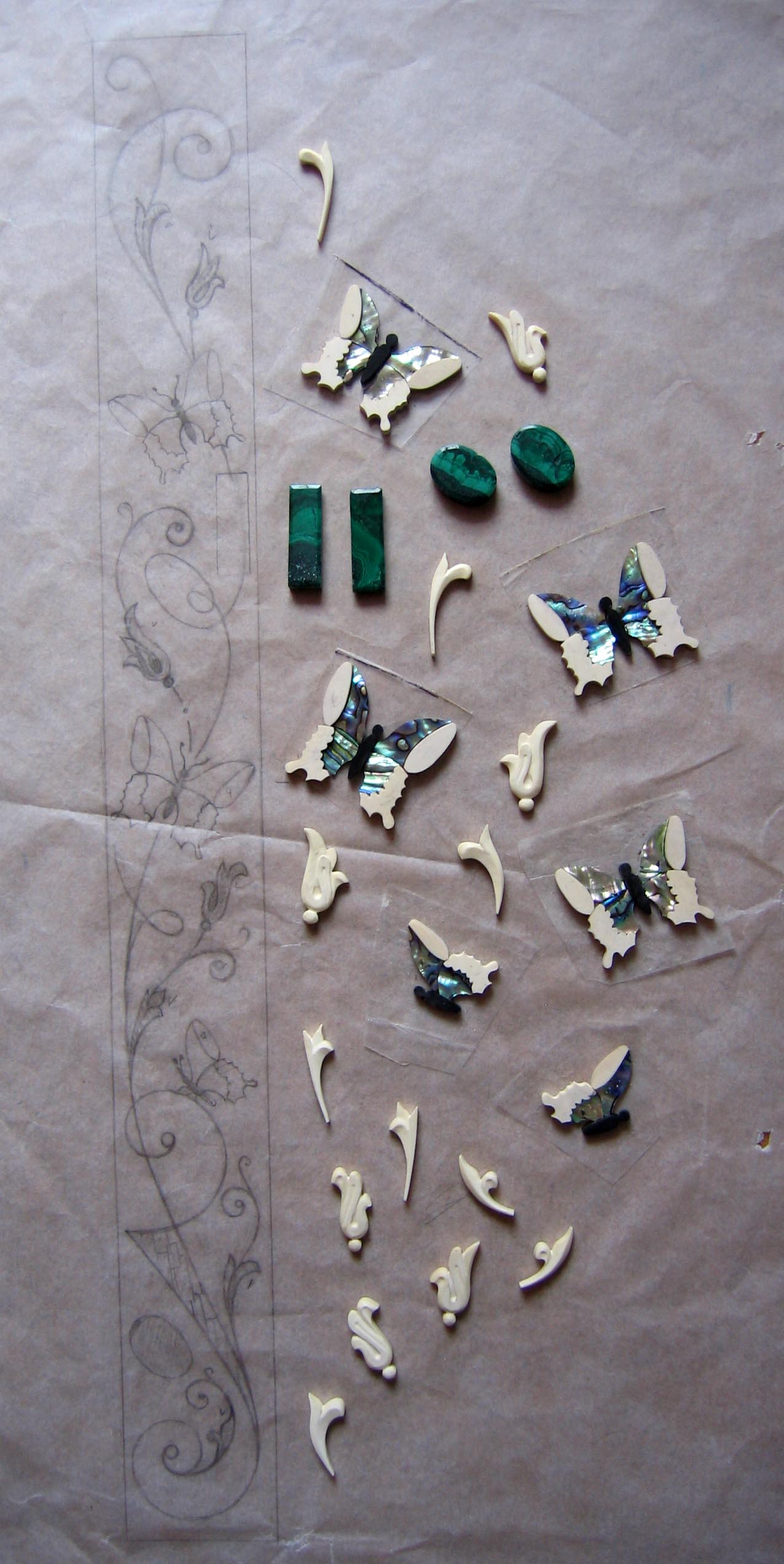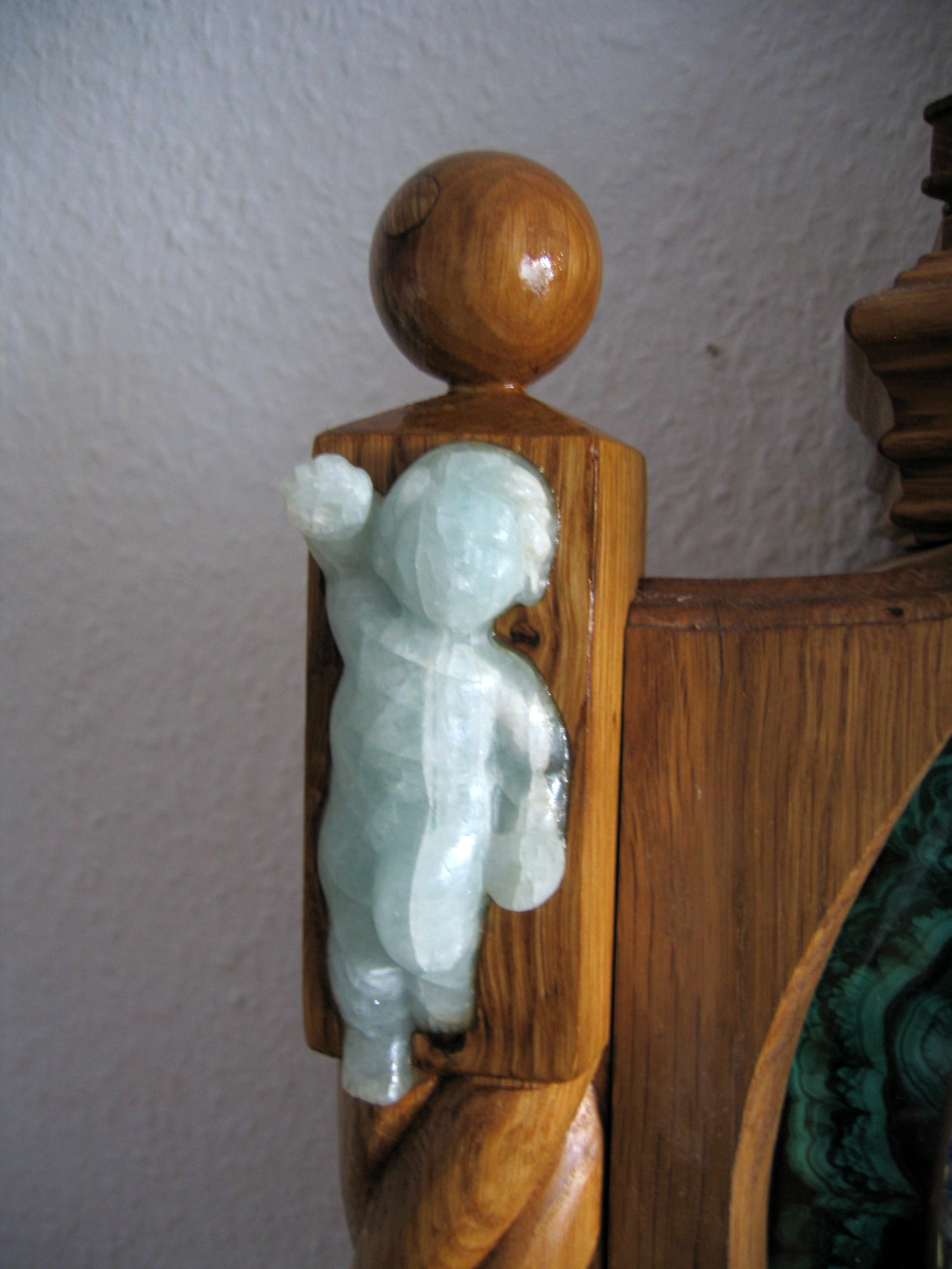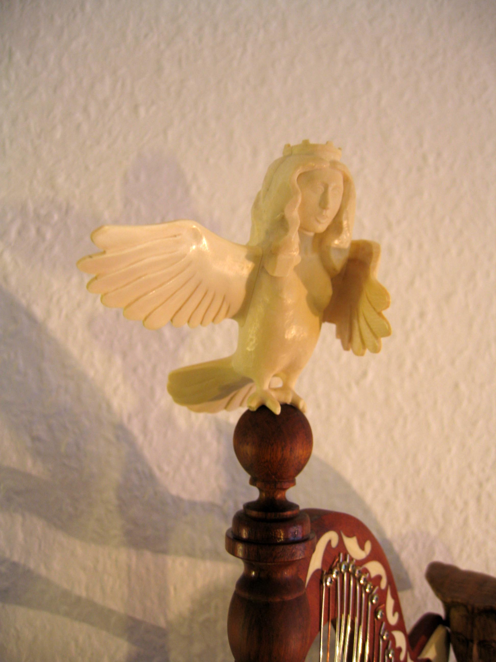 Den oberen Teil des Gehäuses krönt die hölzerne Figur einer Harfenspielerin, über der als Höhepunkt der Komposition ein geflügelter Sirin-Paradiesvogel aus Mammutelfenbein schwebt. Die magischen Klänge der Harfe und der Gesang des Sirin werden von Amoretten aus Aquamarin begleitet, welche die Kapitäle der Seitensäulen schmücken.