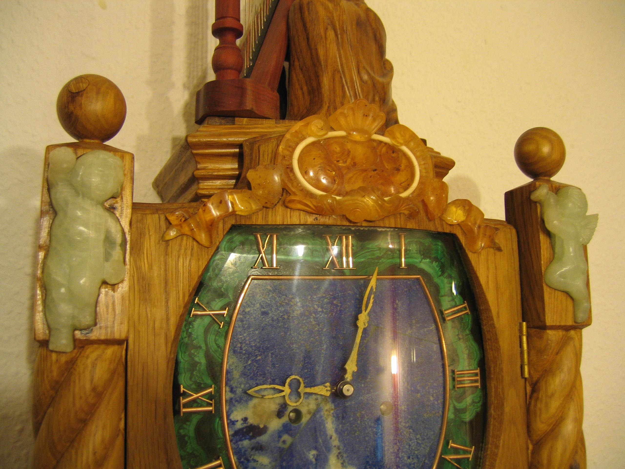 Der Stil der Uhr lässt sich dem Rokoko zuordnen. Für die ästhetische Gestaltung des Gehäuses habe ich zahlreiche dekorative Techniken angewandt. Die Türen weisen farbenprächtige Inkrustationen auf, ergänzt durch Skulpturen im antiken Stil. Das Eichengehäuse ist mit kunstvollen Elementen wie gewundenen Seitensäulen, geschwungenen Füßen und bombierten (gewölbten) Türen verziert.