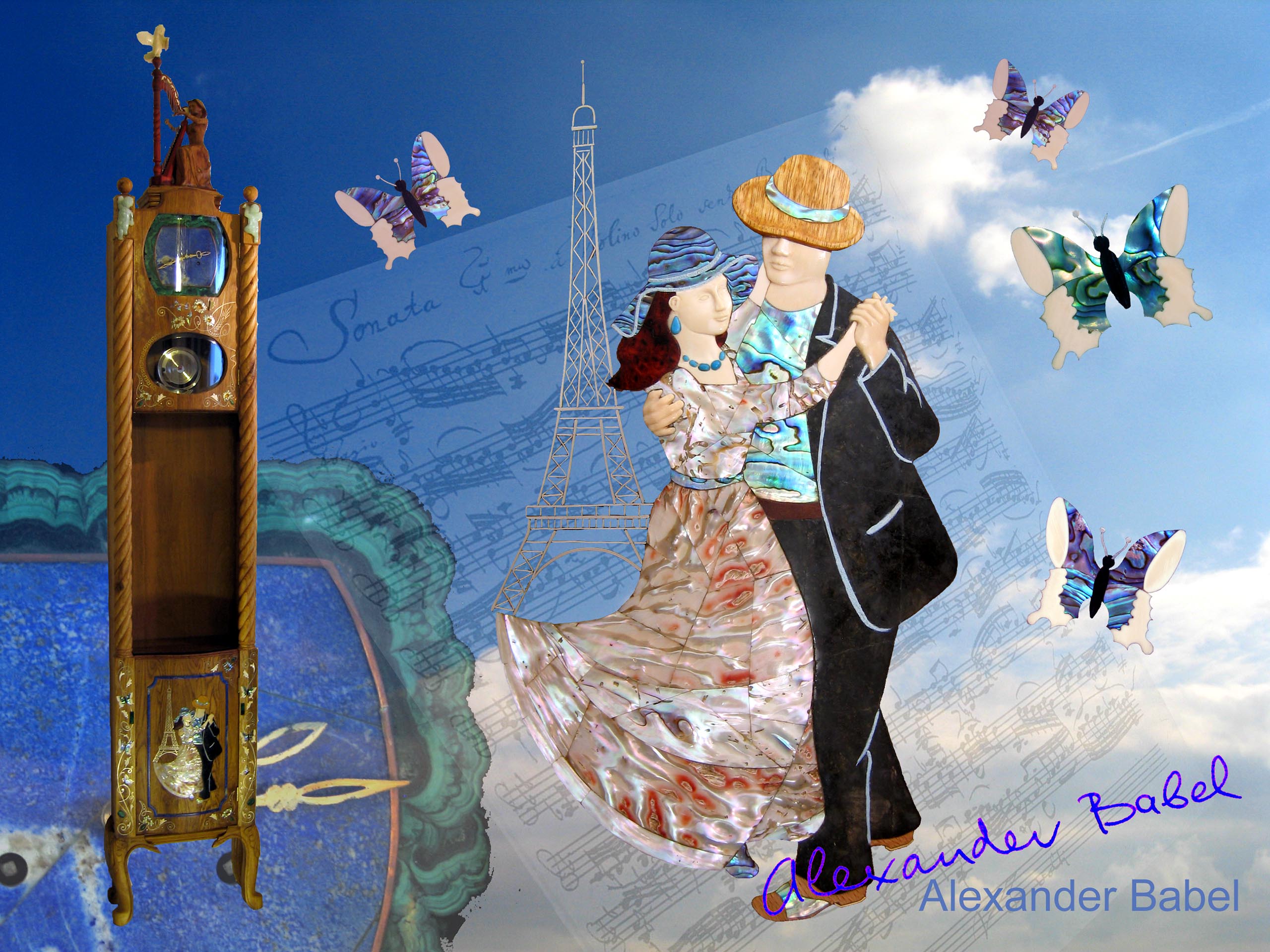 Die untere Tür zeigt ein Einlege-Paneel nach Auguste Renoirs Motiv „Tanz in Bougival“, vervollständigt durch eine Pariser Stadtlandschaft mit dem Eiffelturm im Hintergrund.