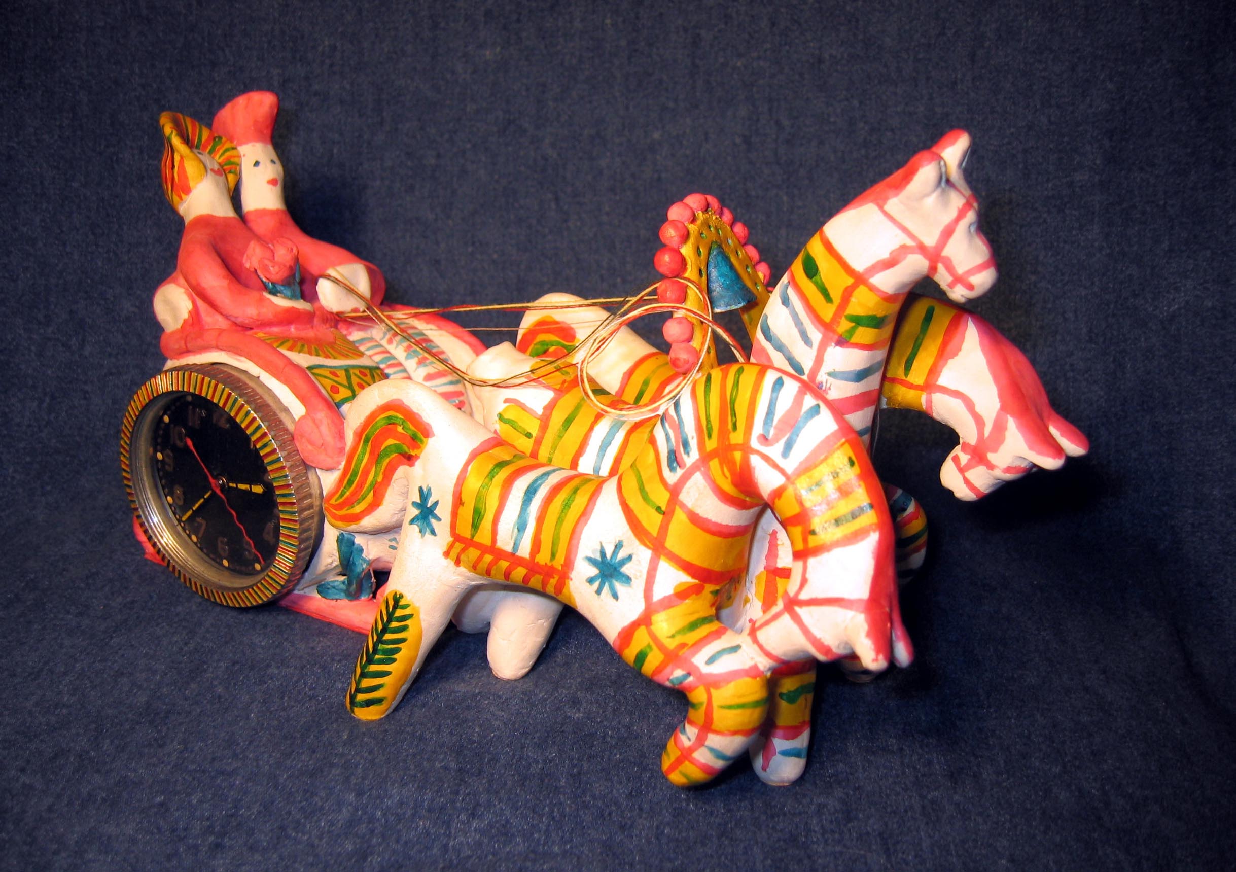 „Troika“, Skulpturenkomposition im Stil der Filimonowo-Spielzeuge mit Uhrwerk (Tscheljabinsker Uhrenfabrik „ЧЧЗ“), Alexander Babel, 2001
