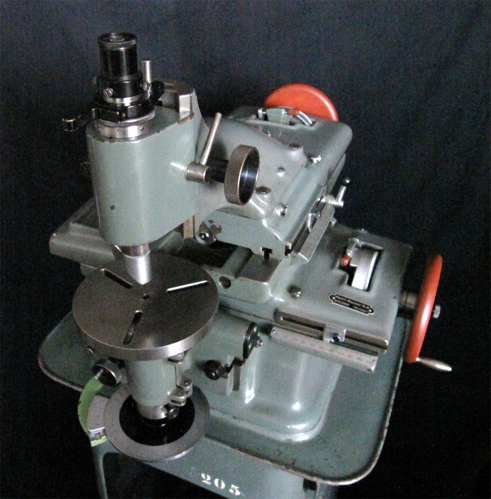 Diese Hauser M1 ist mit einem Runddrehtisch, einem Mikroskop mit 35x Vergrößerung, Zentriereinrichtung und Bohrspindel ausgestattet.