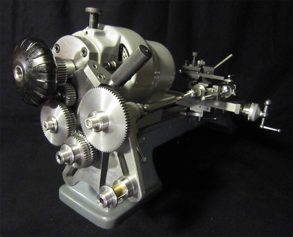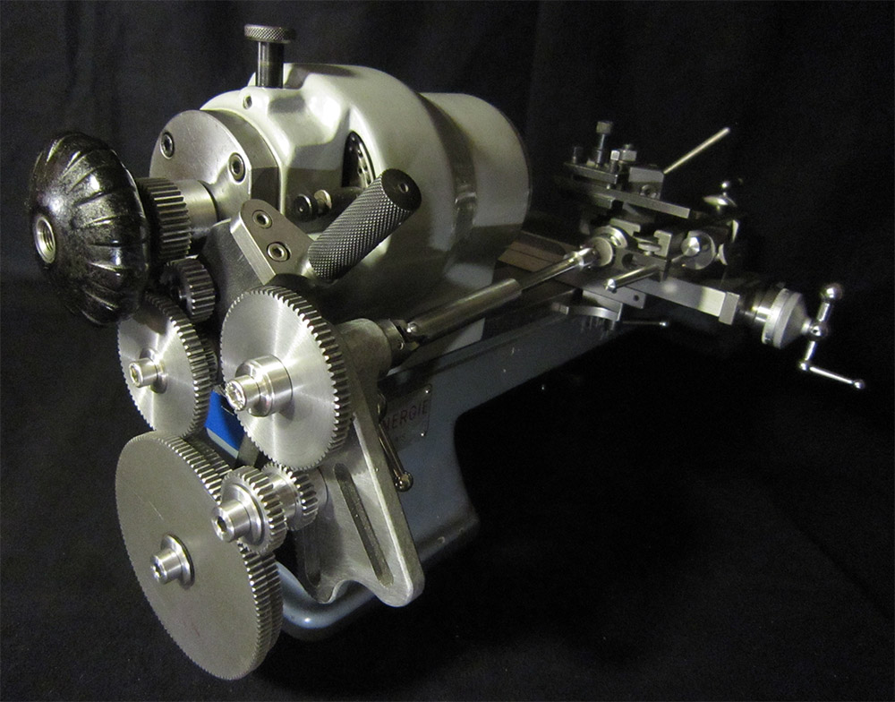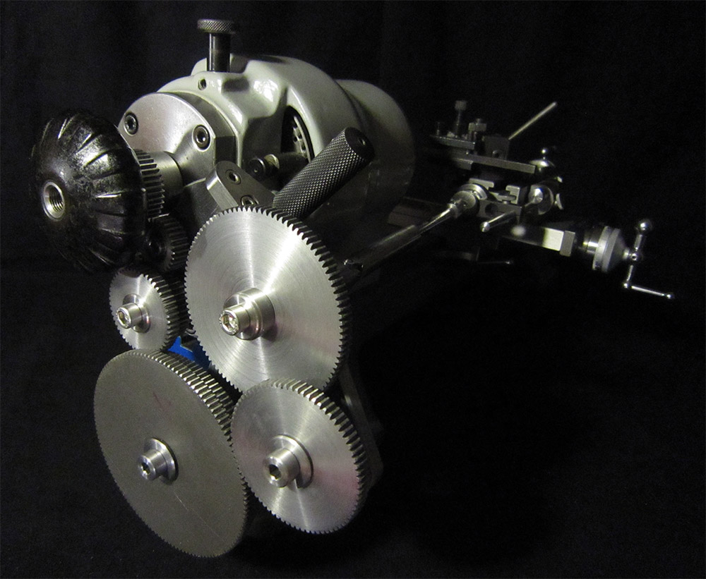 Ein Gewindeschneidapparat ist im Grunde ein Getriebe, das es ermöglicht den Längsschlitten des Kreuzsupportes um eine bestimmte Länge zu verschieben während die Spindel rotiert. In einem Set gibt es 17 Wechselräder. Es ist möglich, alle gängigen Gewindesteigungen sowohl das Metrische-Gewinde wie auch das Whitworth-Gewinde zu schneiden. Die dreifache Schere kann vielseitig mit Wechselrädern bestückt werden. So ist der Wechselrädersatz recht kompakt ausgefallen.