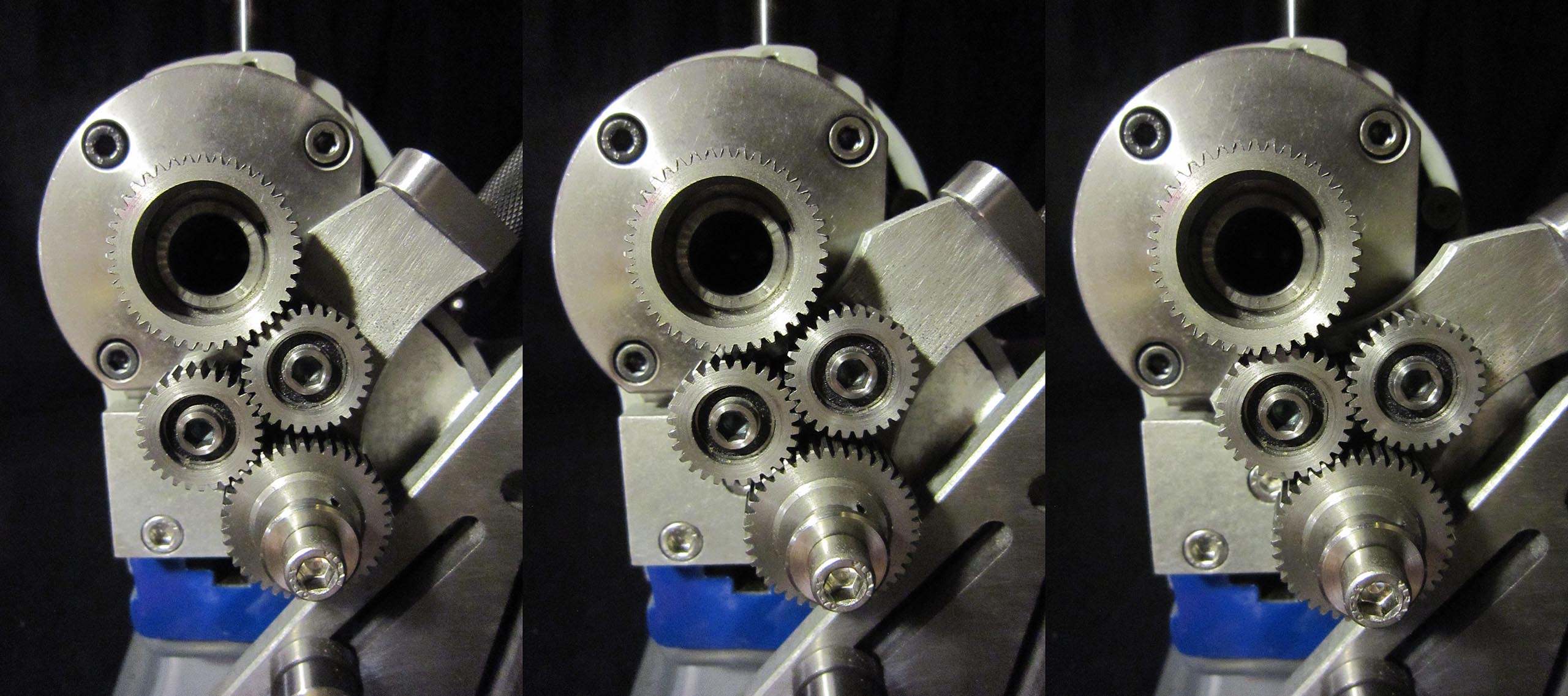 Der Kranz des Antriebszahnrads ist breiter als die Zahnräder. Zwei Zwischenräder sowie das Abtriebsrad auf der Achse des drehbaren Herzstücks sind ebenfalls breiter und laufen stabiler.