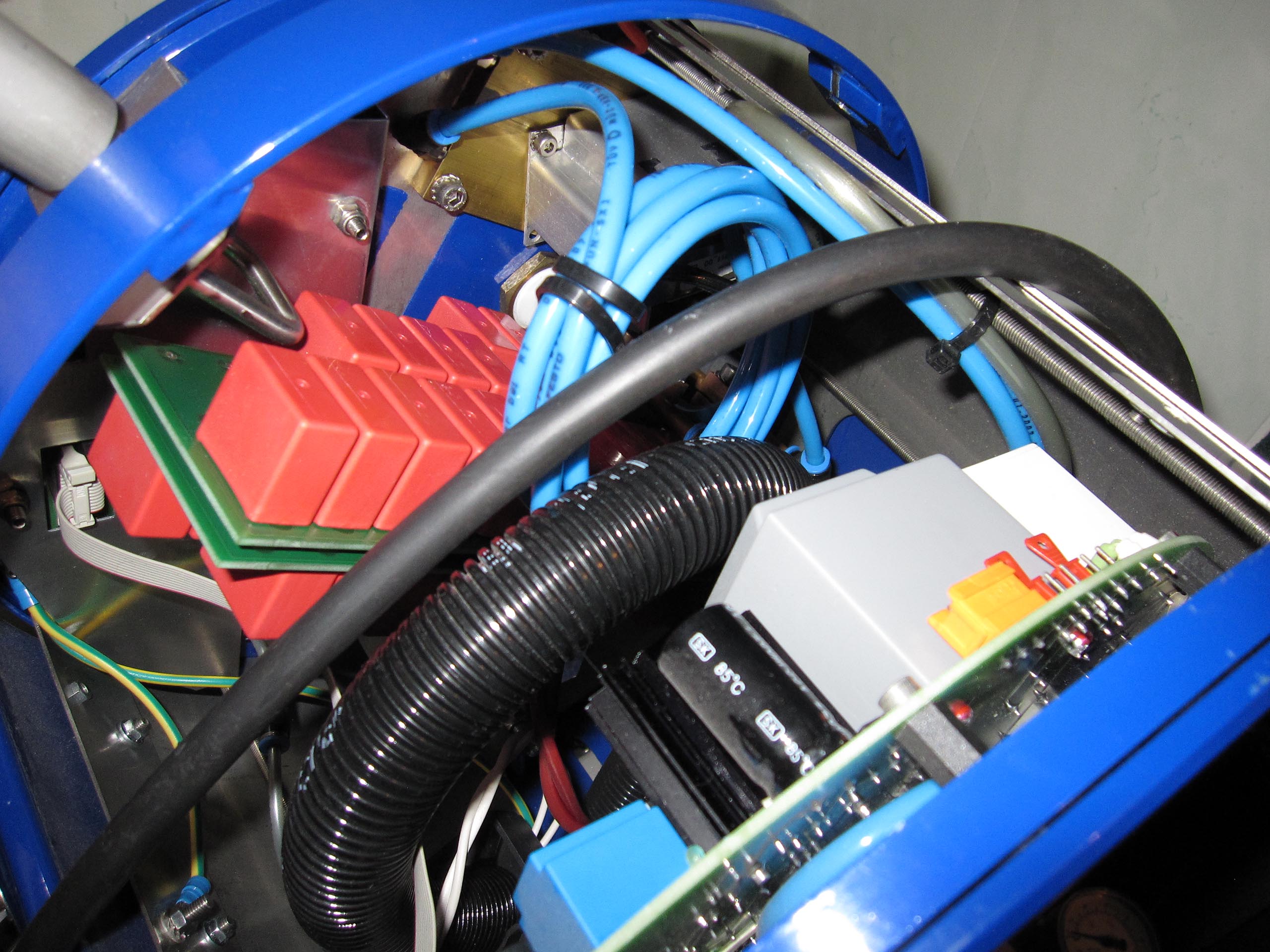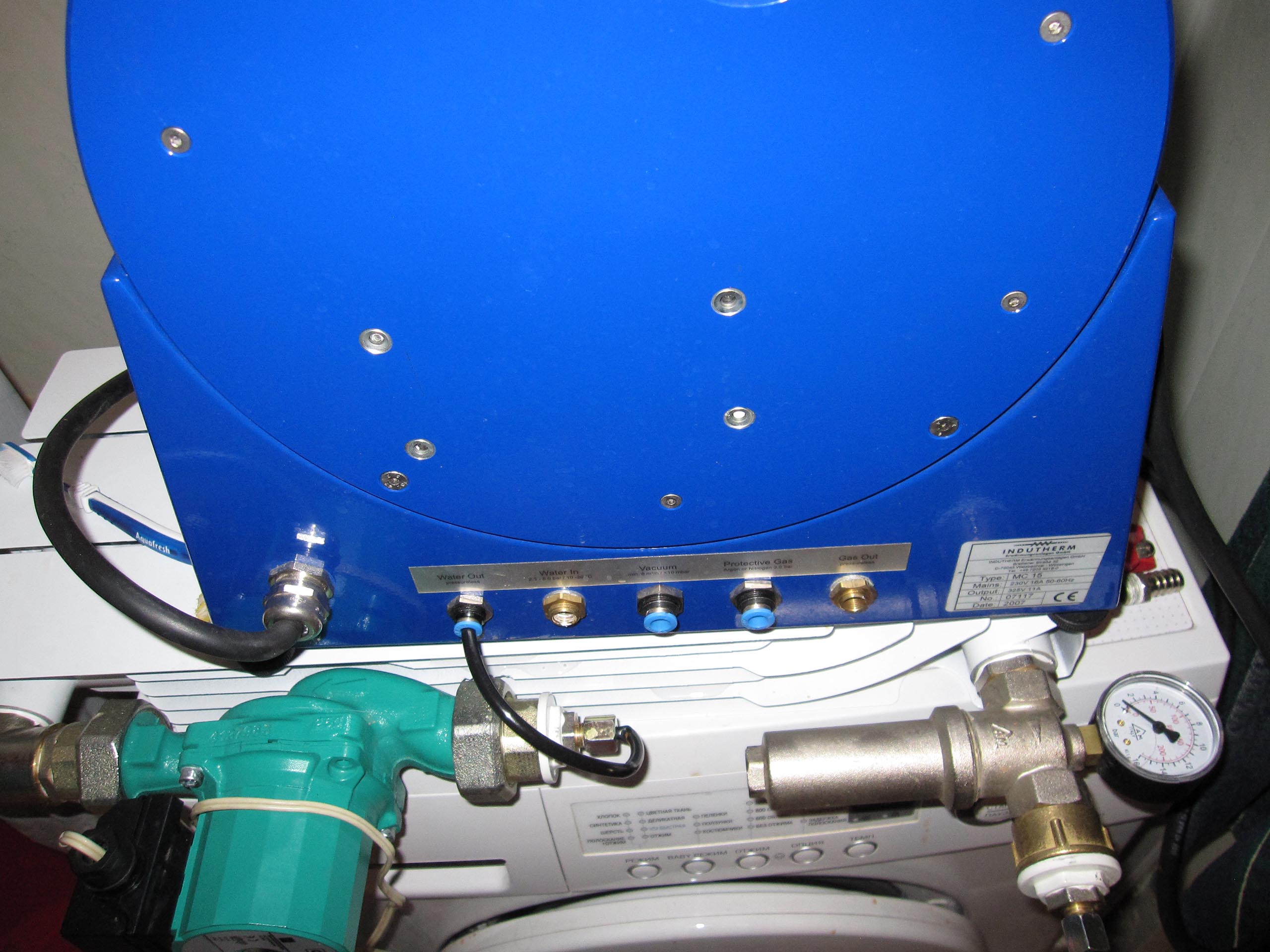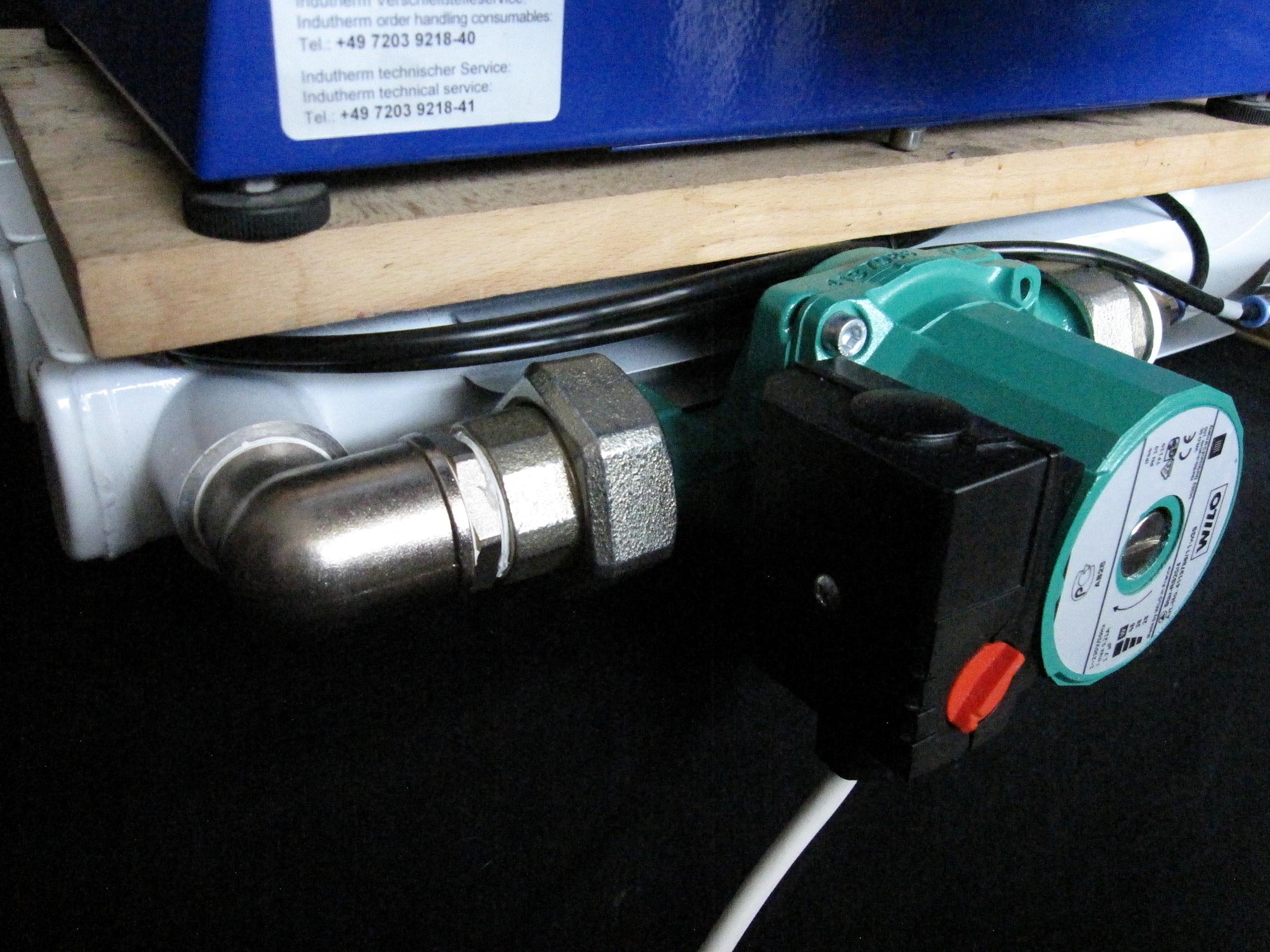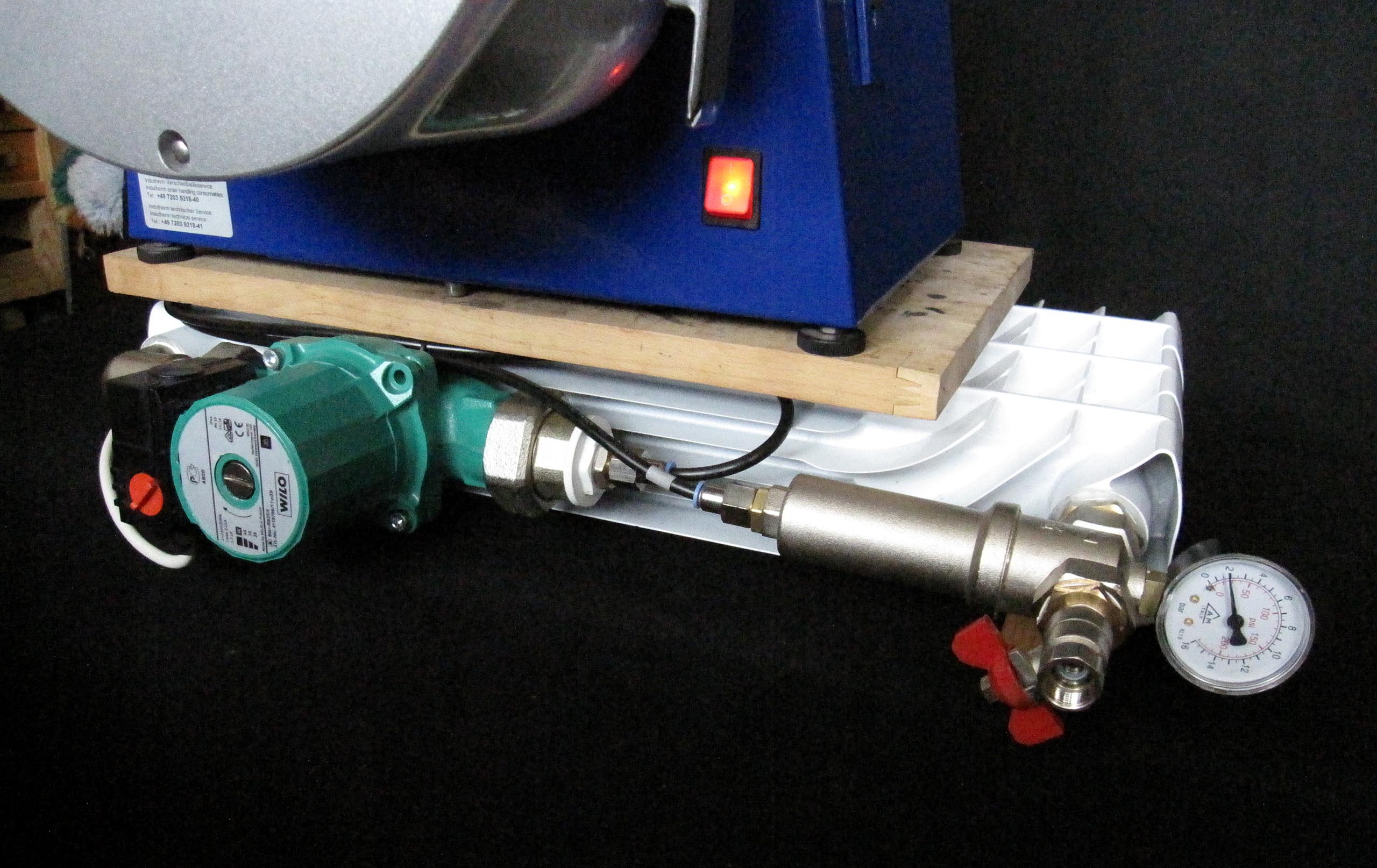 Für diesen Ofen werden außerdem eine Vakuumpumpe, Schutzgas (Argon oder Stickstoff) und eine Kühlung für den Induktionsgenerator benötigt. Um unabhängig von Wasseranschluss und Abwasser zu sein, habe ich ein geschlossenes Kühlsystem gebaut. Dies gelang mir mit einfachen, leicht verfügbaren Mitteln aus Heizungsanlagen: Pumpe, Manometer, Filter mit Absperrhahn, Radiator und Schläuche. Für längeren Betrieb ist diese Kühlung etwas knapp bemessen, für kleinere Arbeitsmengen jedoch ausreichend. Man kann die Kühlung noch verbessern, z. B. durch einen Lüfter am Radiator oder durch Erhöhung der Anzahl der Sektionen.