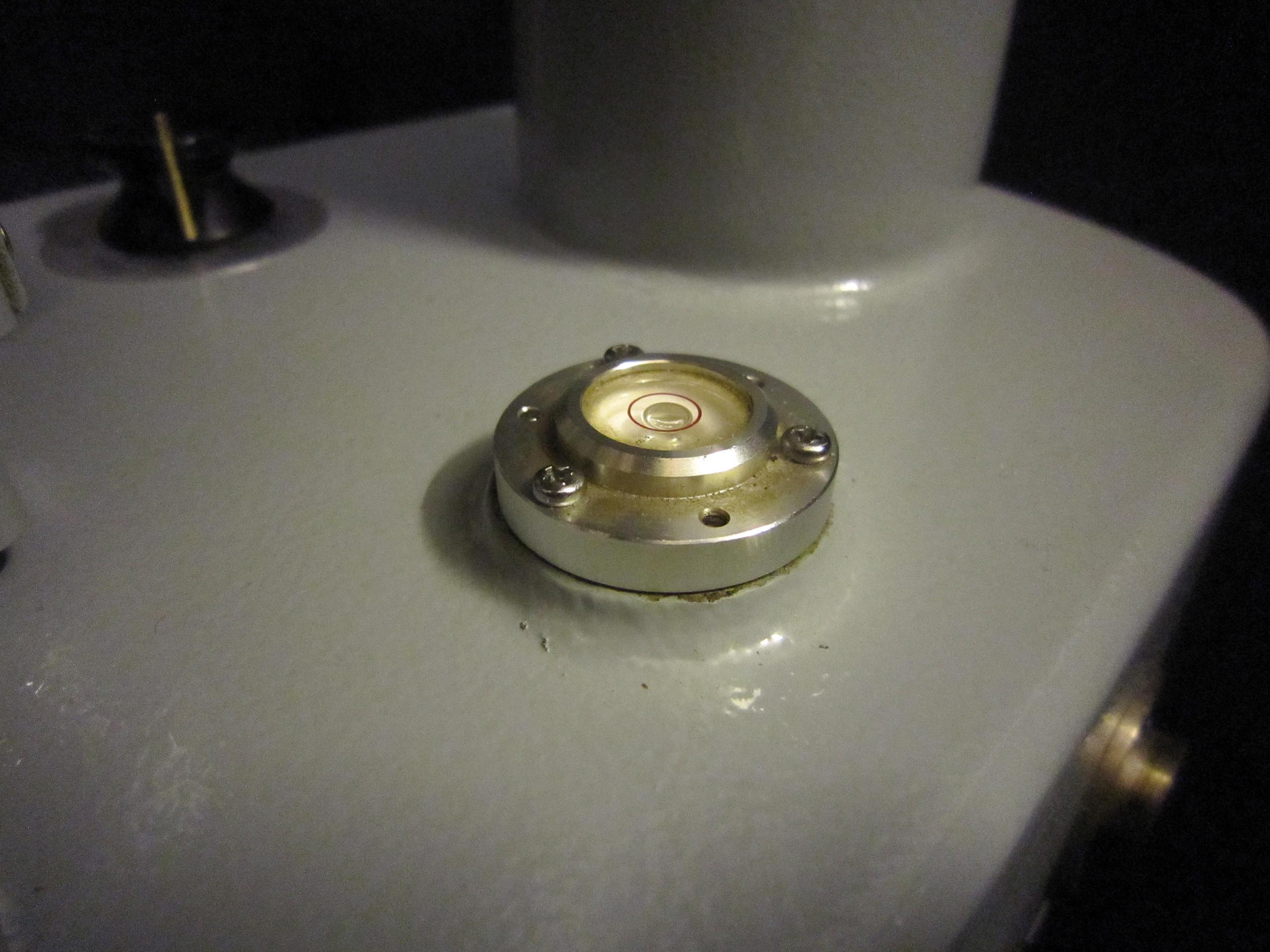 Auf dem massiven Sockel befindet sich eine Wasserwaage, um die Horizontalität genau zu bestimmen. Das Gerät ist sehr präzise, sodass minimale Abweichungen bei Wiederholungsmessungen minimiert werden.